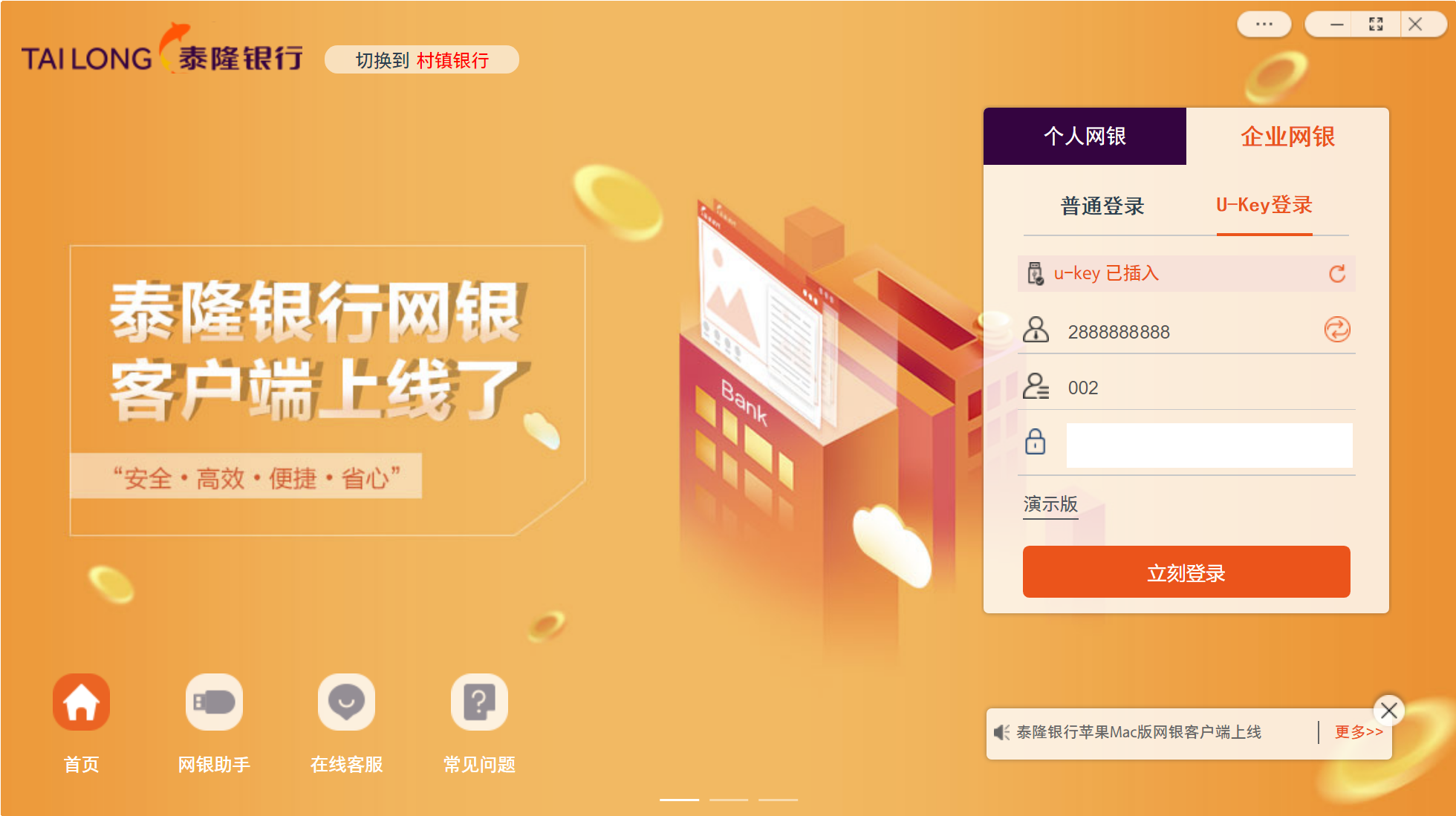 泰隆网银客户端安装包集成了泰隆网银所需要的U-Key驱动、安全控件、下证控件和网银助手,用户只需下载安装该客户端即可,无需单独下载。