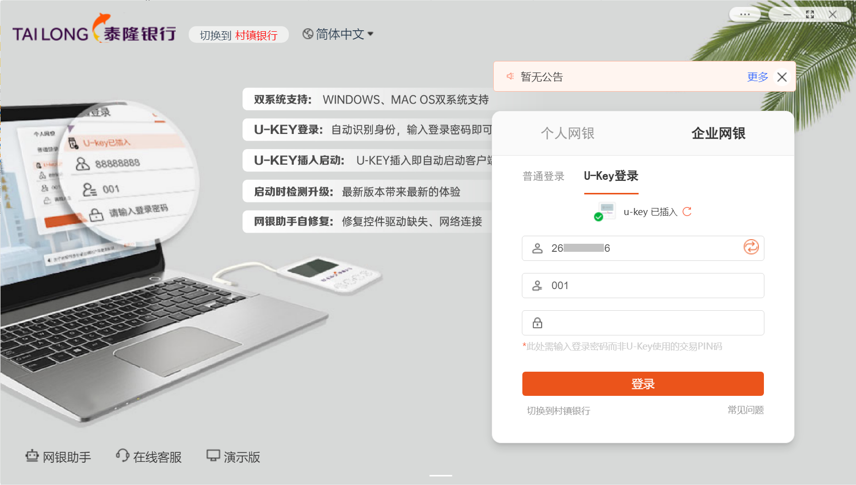 泰隆银行网银客户端安装包集成了泰隆银行网银所需要的U-Key驱动、安全控件、下证控件和网银助手,用户只需下载安装该客户端即可。