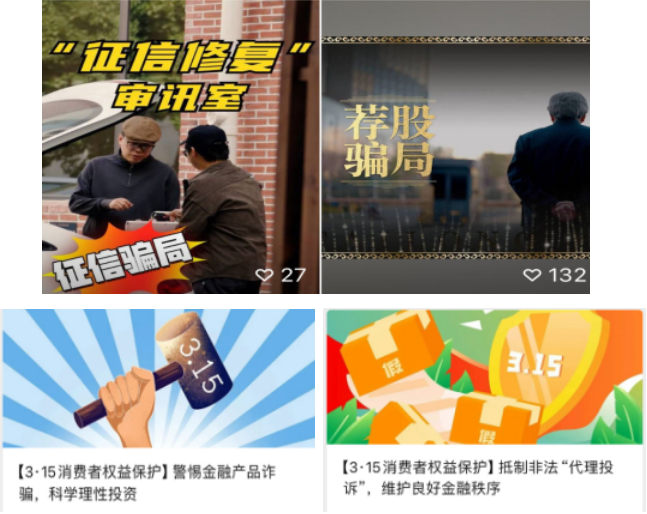 泰隆银行充分利用自身媒体资源,在3·15宣传活动期间通过微信公众号原创推送《警惕金融产品诈骗,科学理性投资》《抵制非法“代理投诉”,维护良好金融秩序》等主题文章。同时泰隆银行结合“许阿舅”IP,拍摄制作“荐股骗局,永远不要相信天上会掉馅饼”“不要落入征信修复骗子的圈套”等“做金融明白人”系列宣传教育短视频,取到了良好的宣传效果。