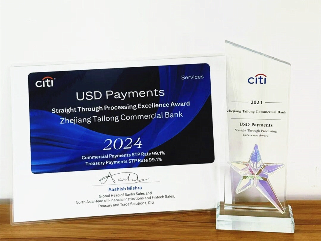 近日,泰隆银行凭借TreasurySTPRate(99.1%)和CommercialSTPRate(99.1%)接近完美的高直通率,再次荣获“2024年度花旗银行美元清算直通率卓越奖”(USDPaymentsStraightThroughProcessingExcellenceAward2024),这也是泰隆银行连续12年获此殊荣。