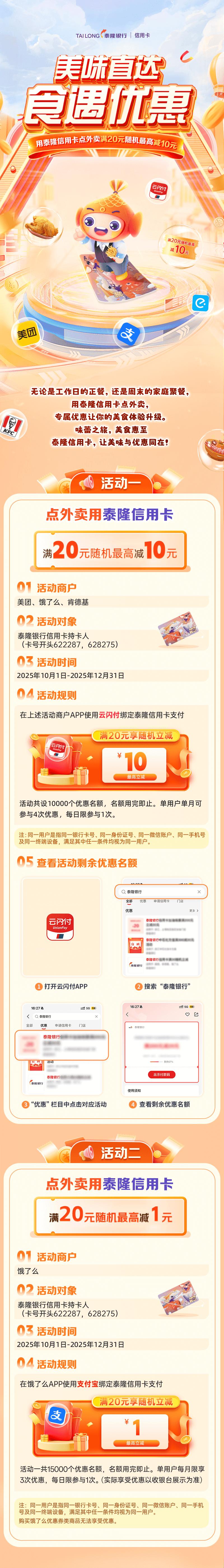 【美食特惠】美味直达,食遇优惠,用泰隆信用卡点外卖满20元随机最高减10元