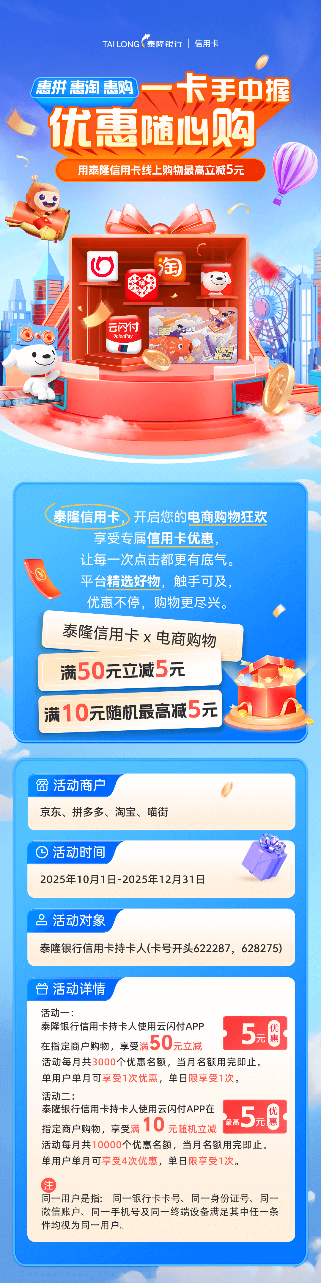 【购物特惠】一卡手中握,优惠随心购,用泰隆信用卡线上购物最高立减5元