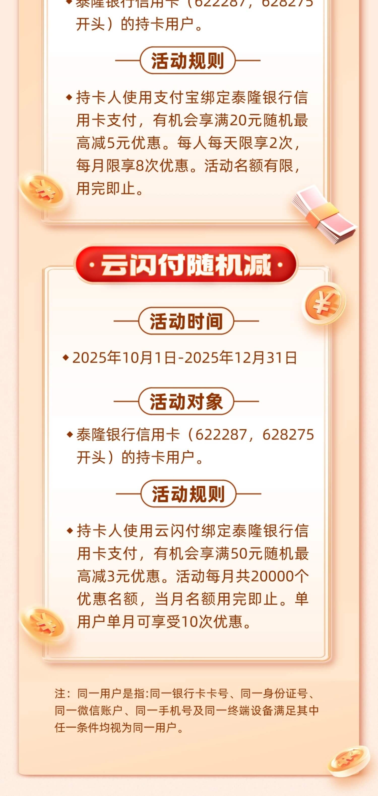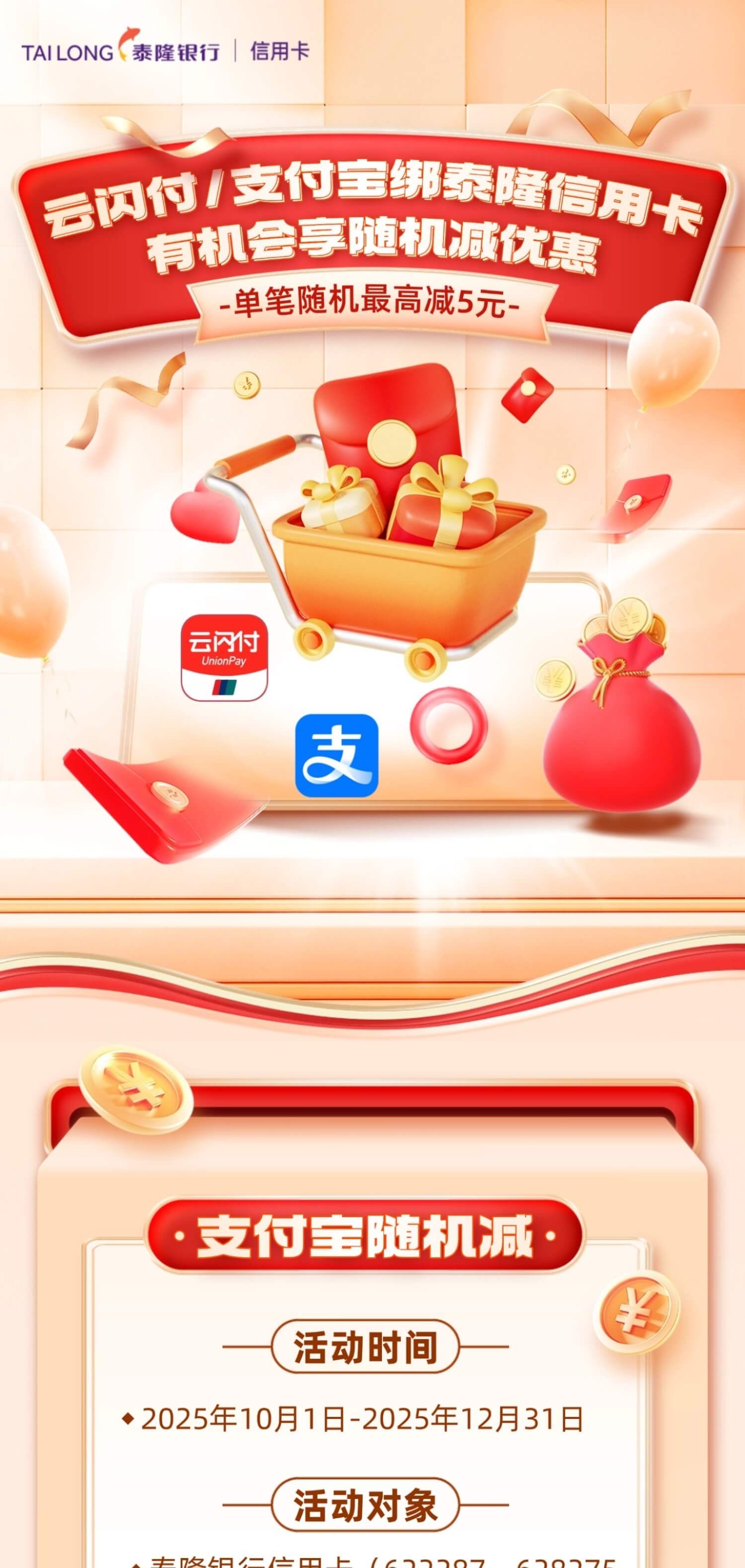 【购物特惠】云闪付、支付宝绑泰隆信用卡有机会享随机减优惠