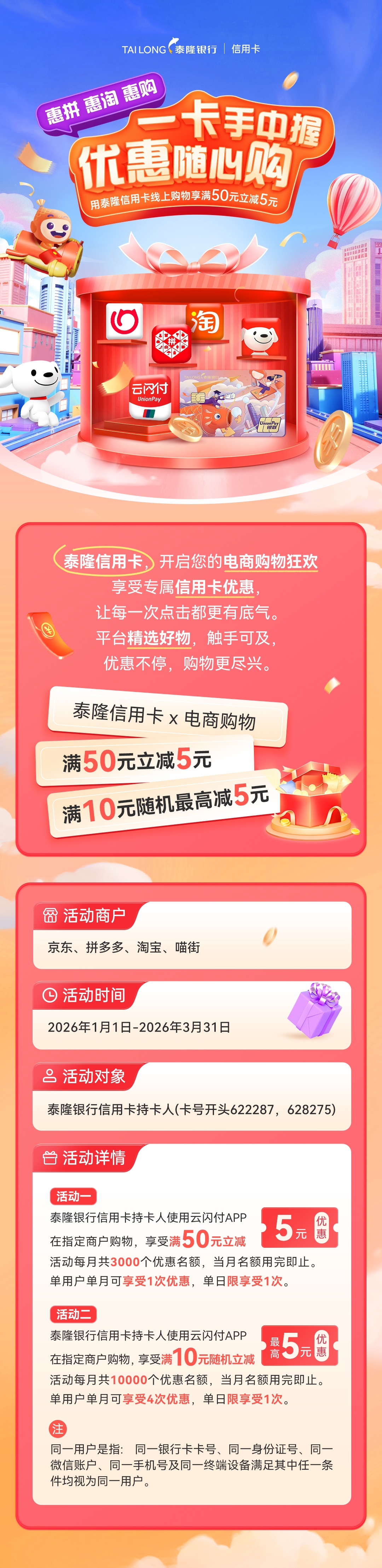 【购物特惠】一卡手中握,优惠随心购,用泰隆信用卡线上购物最高立减5元