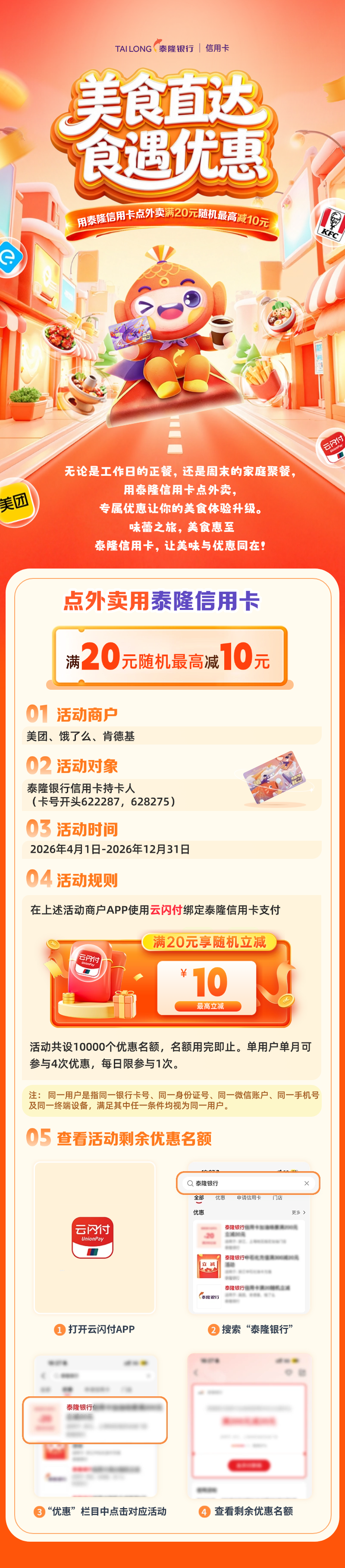 【美食特惠】美味直达,食遇优惠,用泰隆信用卡点外卖满20元随机最高减10元