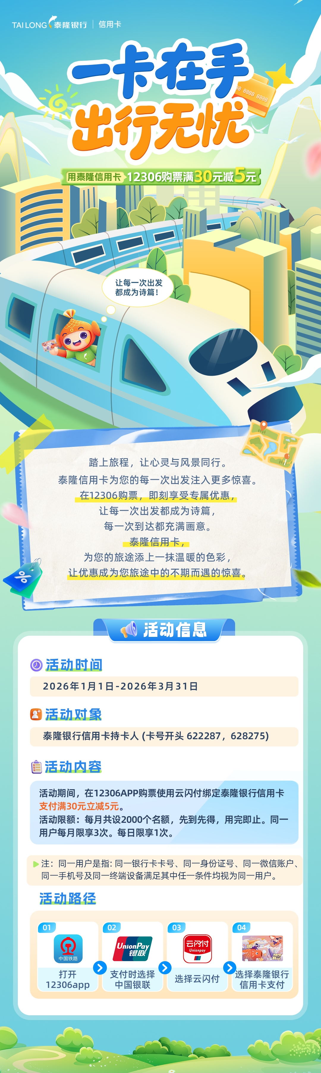 【出行优惠】一卡在手,出行无忧,12306购票满30元立减5元