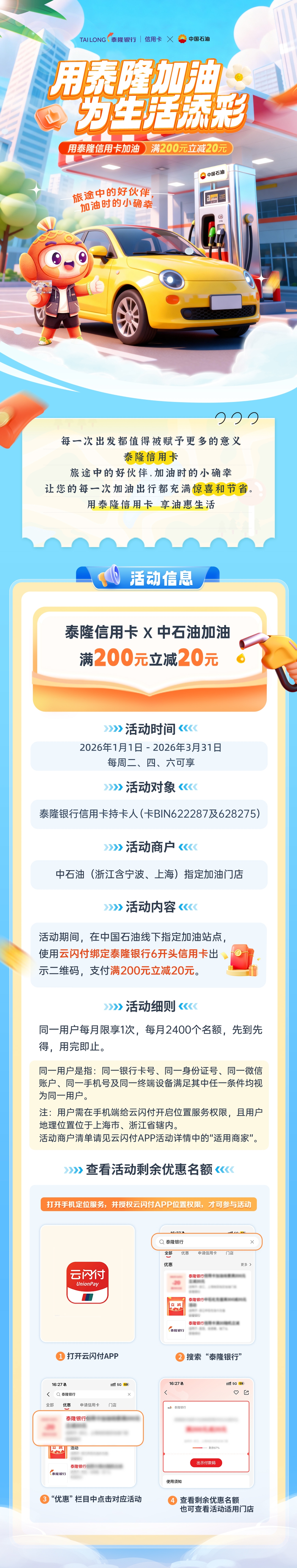【加油特惠】用泰隆加油,为生活添彩,中石油加油满200元立减20元
